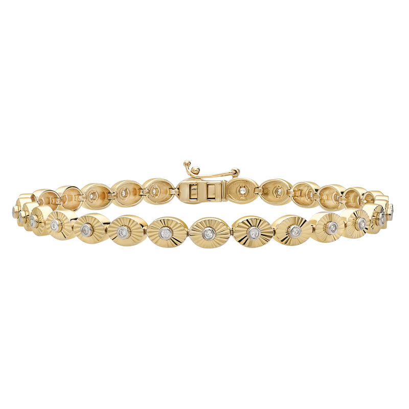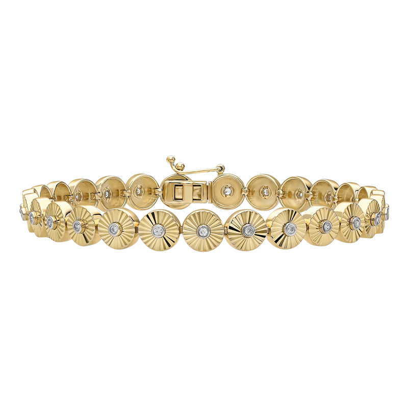 Our Sunray bracelet reimagines the classic tennis/line style with articulated links that radiate light. Each link features a sunray-fluted texture and a bezel-set center stone, creating crisp flashes with every movement. The mirror polish and fluid drape make it effortless for everyday wear—perfect solo or stacked.