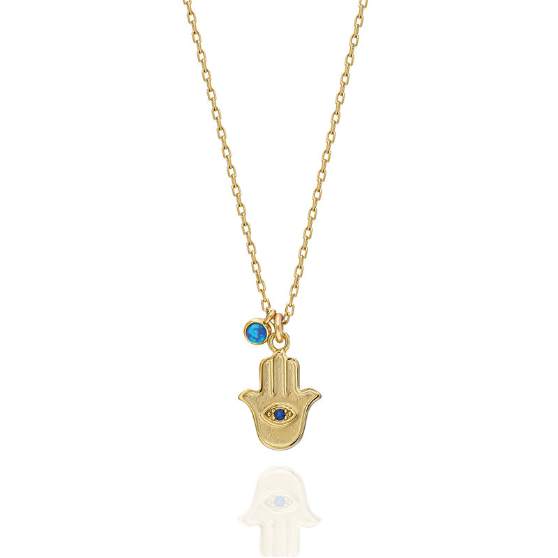 The polished Hamsa features a protective protector-eye set with a deep blue stone, paired with a luminous opal charm for a flash of color and meaning.