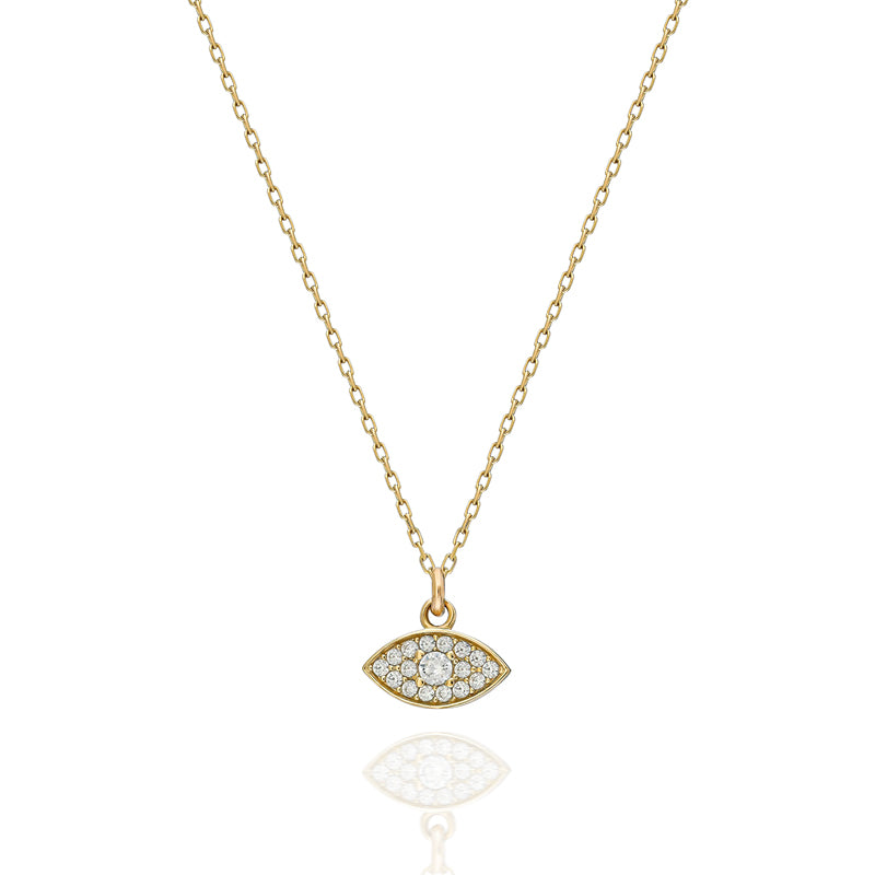 The petite protector eye pendant shimmers with a pavé field and a bezel-look center for extra flash, hanging from a fine cable chain.