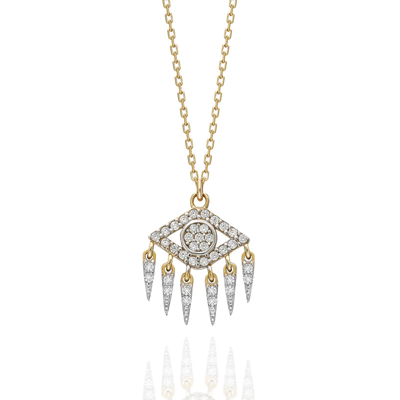 The open protector eye pendant is traced with shimmering pavé and centers a clustered round sparkle.