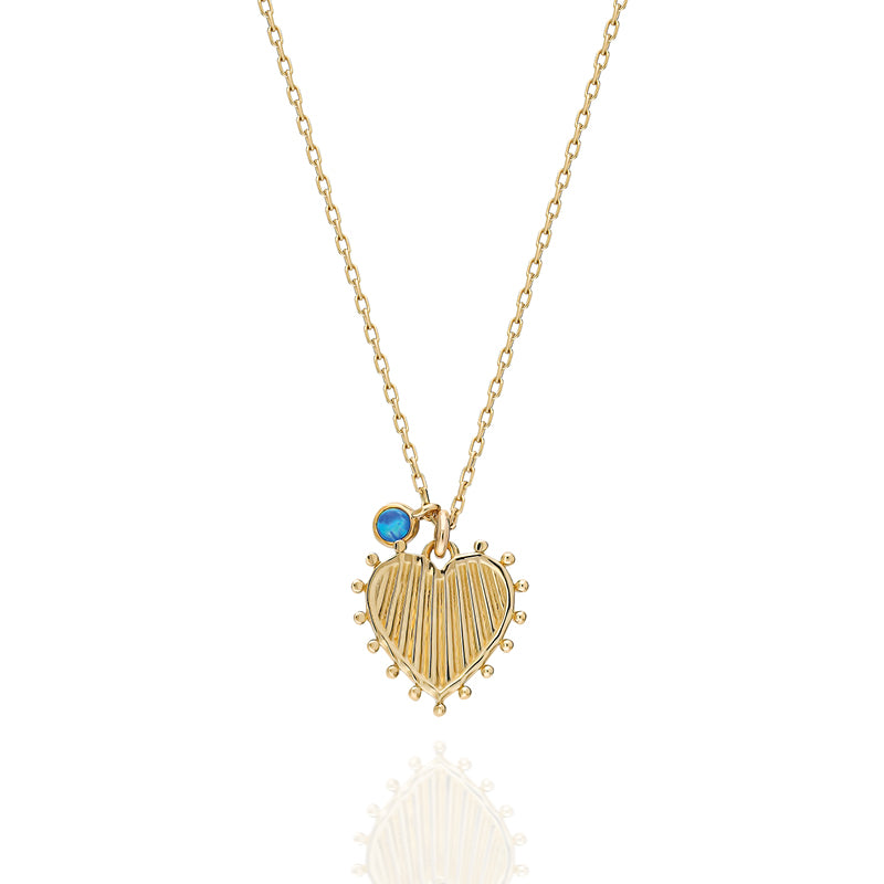 A sweet, modern talisman in solid 14K yellow gold. The petite radiant-fluted heart is framed with a delicate beaded edge and paired with a tiny blue bezel charm for a touch of color.