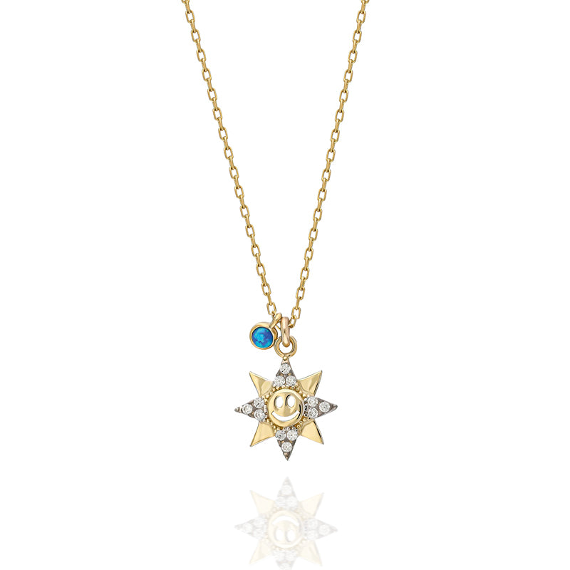 This joyful starburst pendant in solid 14K yellow gold features alternating polished rays and pavé-set tips, with a glossy smiley center for playful shine.