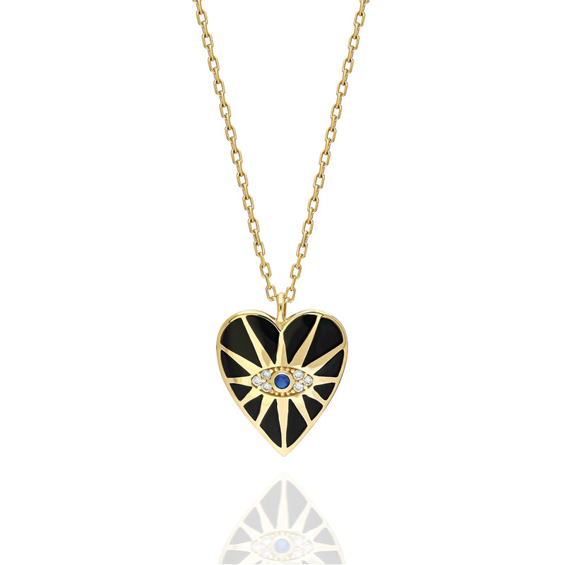 This heart-shaped pendant features glossy black enamel with a radiant sunburst grid and a central protector eye set with a blue bezel stone and pavé accents.